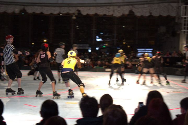 Actually, there was a LOT of binnage; more than I expected. At one point the bin was pretty much full, and the Oakland jammer (who was supposed to come out when the Richmond one went in) kind of hesitated for a few seconds before going back in and then the benchies had to yell at her to get back onto the track. Also, I think there was one other bit when there were too many blockers in the bin, but I can't remember. One thing I did notice though was that most people tomohawked to the bin, because you could go straight there real quick and then sit down, rather than go there, knee slide and then have to get back up before your butt hit the seat. I guess that kind of timing matters.
